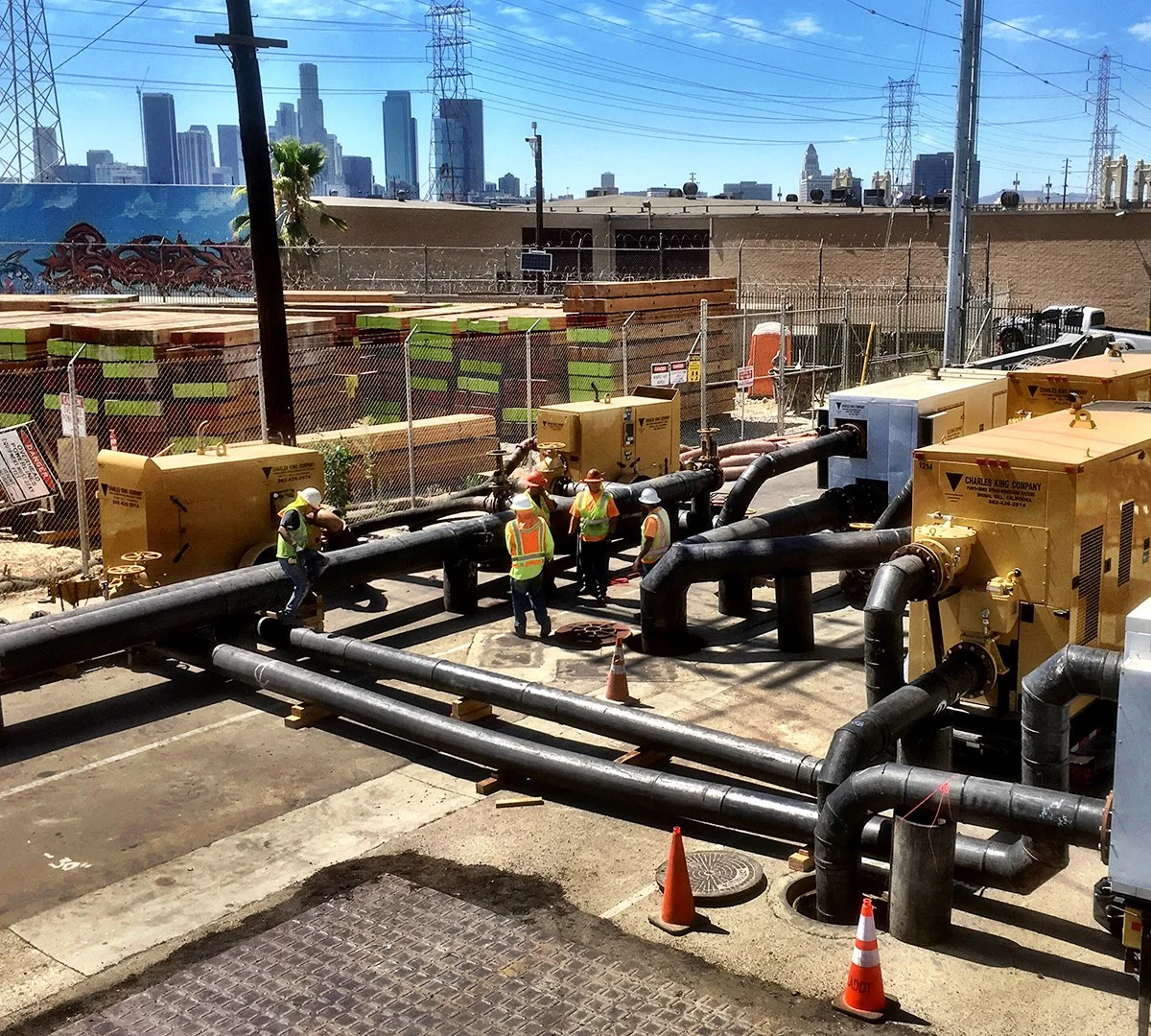 We are equipped with equipment, personnel, and experience in responding to water/wastewater emergencies. We stand ready to mobilize equipment and personnel 24/7/365. This includes immediate mobilization of traffic control, pumps, piping, and excavation equipment. We are experienced in working directly with municipalities or their contractors. We have an extensive fleet of pumping equipment ready for immediate deployment. With over 50,000 feet of HDPE pipe, pre-loaded on trailers and trailer-mounted diesel pumps to up to 700 Horsepower/24″, we are ready to roll. Our history of rapid and effective response has resulted in our securing numerous contracts with local municipalities to provide pumping and pipeline repair services on an as-needed/emergency basis and has been first on the scene at many of Southern California’s most significant sewer failures.